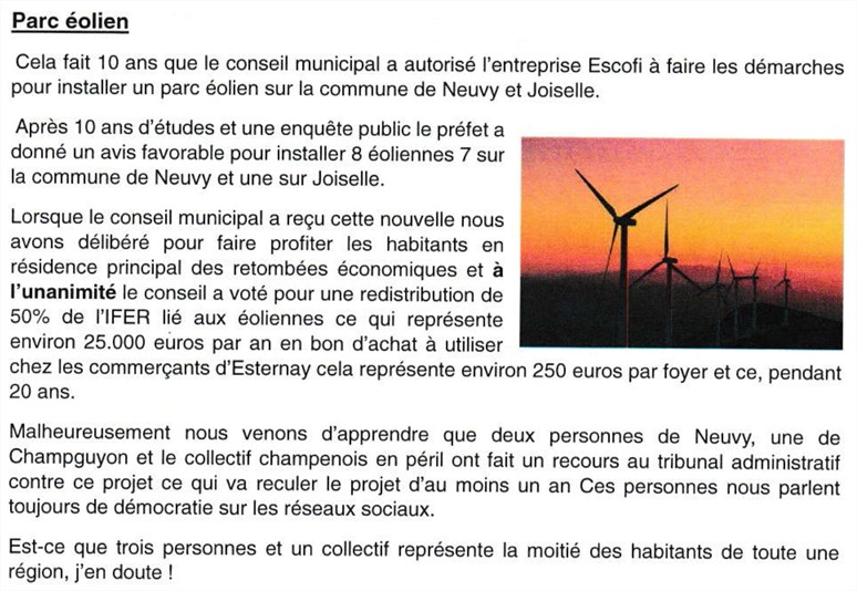 Oui notre collectif et des habitants du secteur ont porté recours contre l’autorisation du projet éolien sur Neuvy et Joiselle.