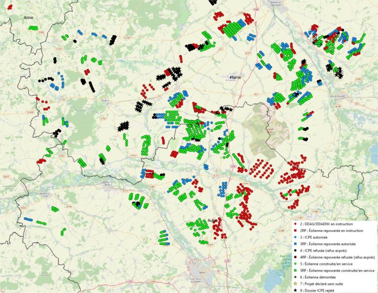 Dernières données de la DREAL mises en forme (vert existant, bleu autorisé, rouge instruction, noir refusé/annulé). 4,9 GW d’installés, 2,5GW d’autorisés soit 7,4GW. A venir 3,3GW d’instruction, un total potentiel de près de 11GW. Focus sur le Sud Ouest de la Marne et le Nord de l’Aube. Là où nous pouvons intervenir, en haut à … Lire la suite de Statistiques éolien Grand Est Août 2025